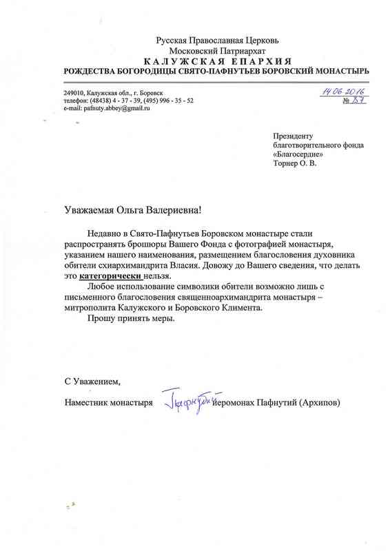 Наместник монастыря иеромонах Пафнутий (Архипов) обратился к Президенту фонда "Благосердие" Торнер Ольге Валерьевне, в связи с тем, что в монастыре без благословения распространяется брошура с символикой нашего монастыря - делать это категорически нельзя. Далее наместник поясняет - любое использование символики возможно лишь только с письменного благословения Митрополита Калужского и Боровского КЛИМЕНТА. Прошу принять меры, обратился наместник к Призиденту фонда.