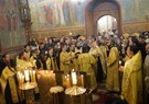 Братия, приложившись ко кресту, с чином Панагии проследовала на трапезу.