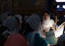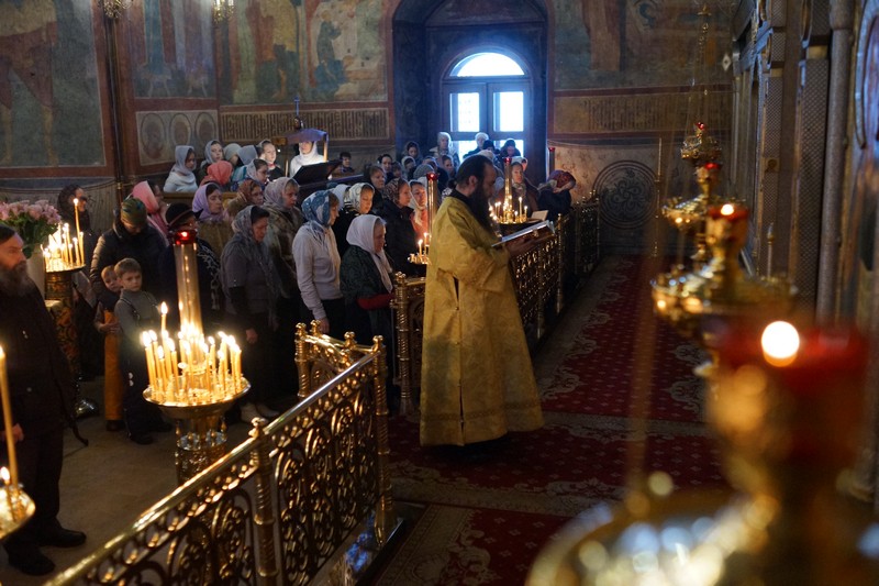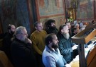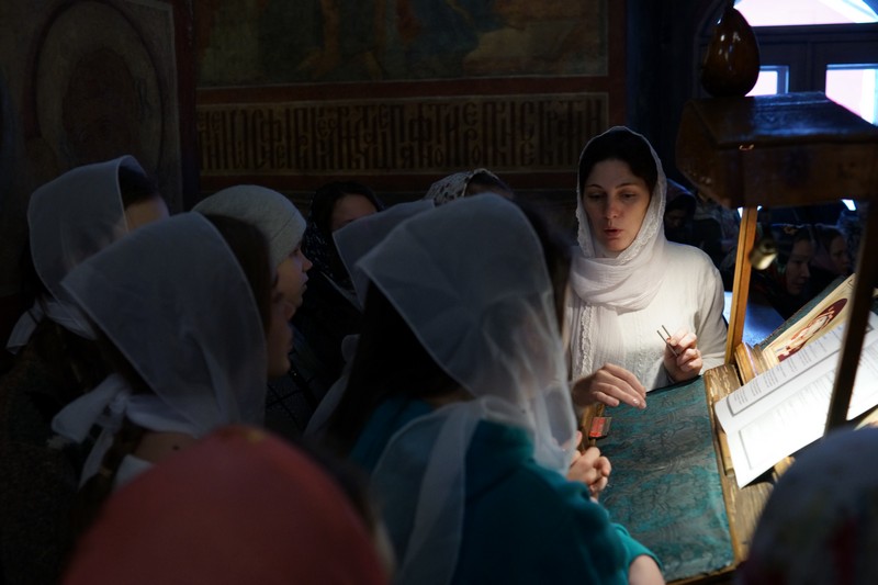 К мужскому хору на Поздней Божественной Литургии присоединился хор воспитанниц Воскресной школы монастыря под руководством регента Александры Зуб.