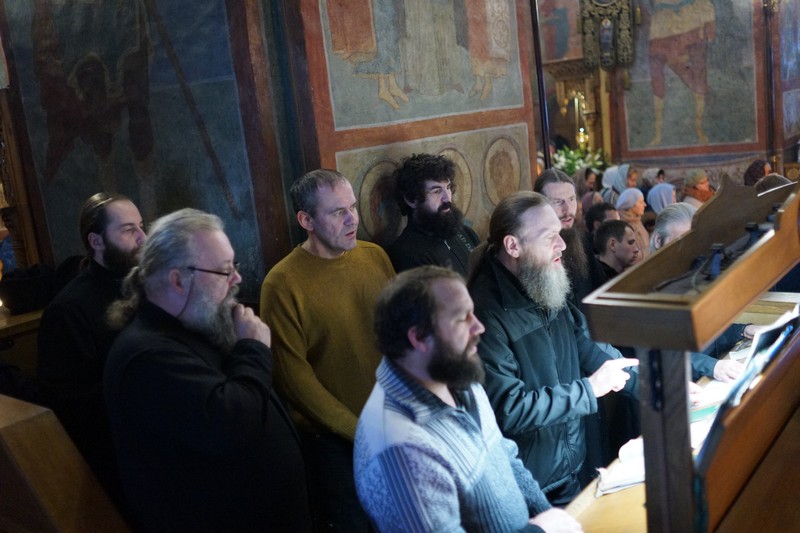 Богослужебные песнопения на Всенощном бдении и Поздней Божественной Литургии исполнил мужской хор под управлением регента Александра Яркова в составе: иеродиакона Нифонта (Луценко), инока Фиофилакта (Градава), послушника Андрея Новикова, послушника Сергия Никонова, Александра Васильева, Евгения Москалева и Михаила Борюхина.