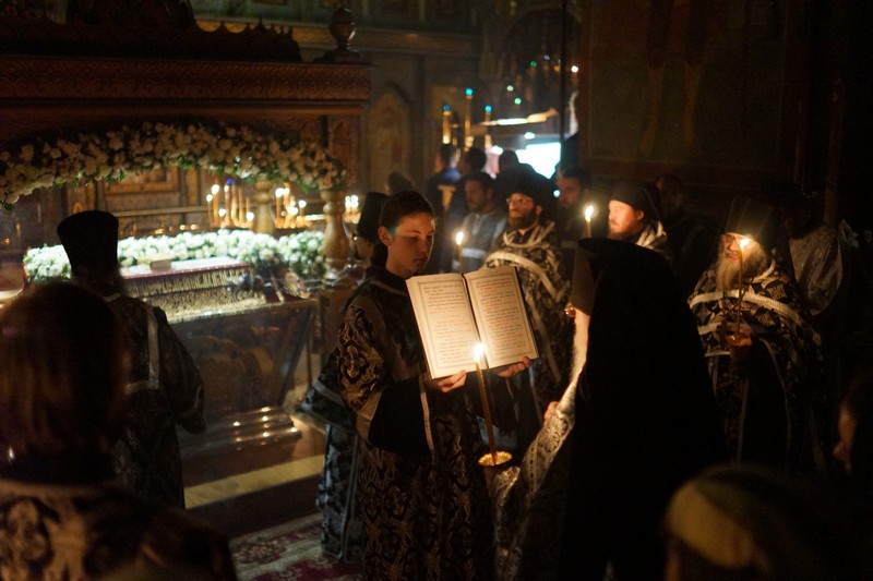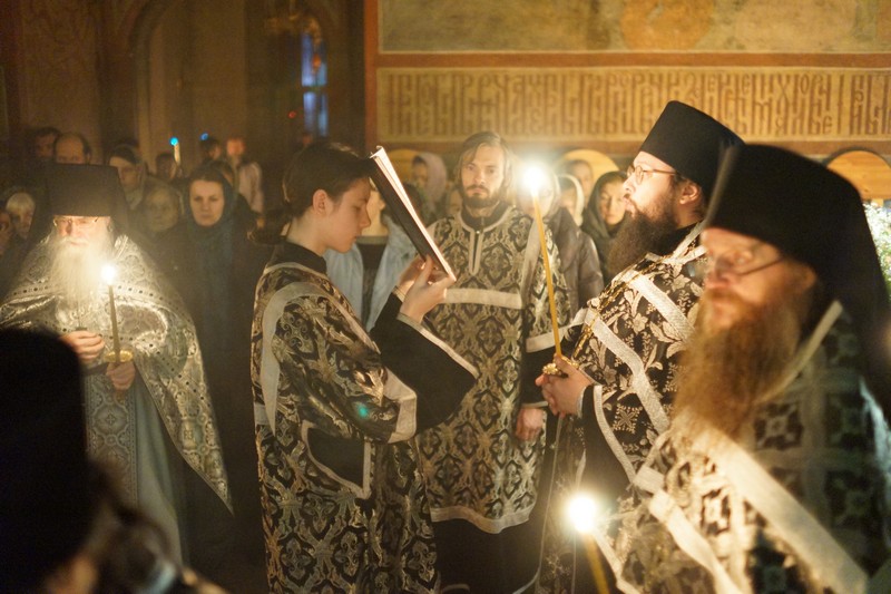 Ночное Богослужение, включающее в себя утреню с похвалами, чином погребения с крестным ходом во круг Собора Рождества Богородицы, Вечерню с Литургией Василия Великого, а накануне в пятницу в 14:00 было отслужена Вечерня с чином выноса Плащаницы Господа Иисуса Христа, а затем Малое повечерие с каноном о Распятии Господнем и на плач Пресвятой Богородицы.