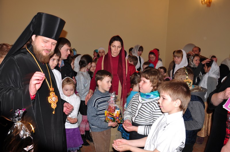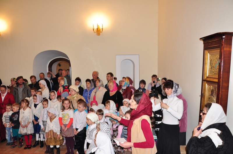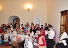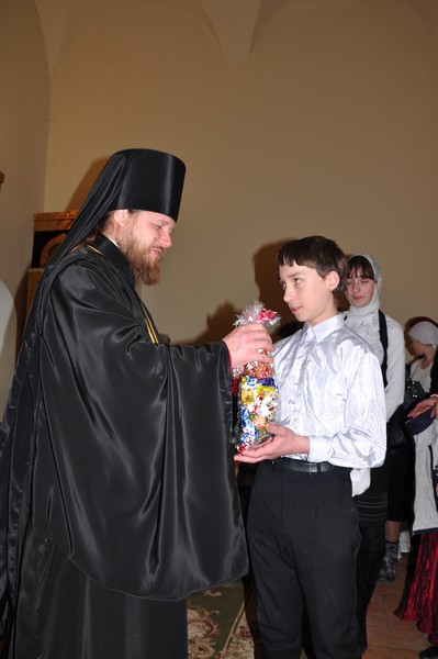 Вслед за этим отец Серафим принял поздравления от воспитанников Воскресной школы монастыря, которые исполнили праздничные песнопения.