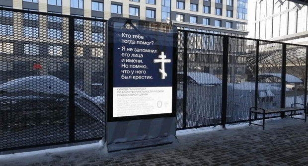 «Кто тебе тогда помог?» — «Я не запомнил его лица и имени. Но помню, что у него был крестик», — такой диалог представлен на рекламных макетах.
