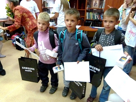 Но на этом подарки не закончились: ребята вдобавок получили индивидуальные расписания с символикой «Самсунга», пожеланиями хорошей учёбы и подбадриваниями, футболки и банданы, тоже с символикой компании, и, самое главное, что вызвало восторг и восхищение детей, – новенькие современные телефоны.