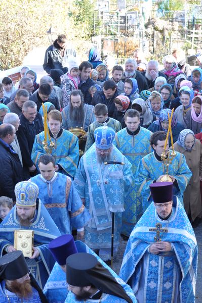 После Литургии вокруг храма был совершен Крестный ход с иконой Покрова Пресвятой Богородицы. После чего все снова собрались в храме, чтобы послушать проповедь епископа Никиты. Он напомнил историю возникновения праздника Покрова на Руси. «Чудо, прославленное Церковью, произошло в храме во время всенощного бдения, когда город Константинополь (да, один из самых любимых нашим народом праздников зародился не в России, хотя его и нет в православных календарях других стран) был окружен многочисленным неприятелем. Все находившиеся в церкви горячо молились об избавлении от врага. Свою молитву к Господу и Божьей Матери возносил и святой Андрей, принявший на себя подвиг юродства ради Христа. Многие в городе смеялись над ним. Благодушно терпя издевательства и голод, он ходил по улицам в одной только рубахе, проводил ночи на холоде, а милостыню. которую ему подавали, раздавал другим нищим. Господь наградил его даром прозорливости. Молясь во время всенощной вместе со всеми прихожанами, он вдруг увидел Пресвятую Деву, шествовавшую по воздуху в окружении ангелов и святых. Святой пророк Иоанн Предтеча и апостол Иоанн Богослов сопровождали Царицу Небесную. Преклонив колени, Богоматерь долго молилась, а затем, подойдя к престолу, сняла со Своей головы покров и распростерла его над молящимися в храме, знаменуя тем самым подаваемую Ею всему христианскому миру защиту от видимых и невидимых врагов. Святой Андрей со страхом и трепетом созерцал это Божественное видение и спросил стоящего рядом своего ученика блаженного Епифания: «Видишь ли ты брат, Царицу и Госпожу, молящуюся о всем мире?» - «Вижу, святой отче, и ужасаюсь». Пречистая Дева стояла «на воздухе молебно простирающу всечестнеи Свои руци, просящее умирения миру и спасения душ наших», - говорится в праздничной стихире. Святые Андрей и Епифаний, удостоившиеся созерцать молящуюся Богоматерь, долгое время смотрели на распростертое перед народом покрывало и на блиставшую, наподобие молнии, Славу Господню. Доколе была там Пресвятая Богородица, видимо было и покрывало, по отшествии же Ее сделалось и оно невидимым. Заступничеством Пречистой Девы враг был отогнан от стен Константинополя, а память о чудесном явлении Богородицы осталась в народе.
