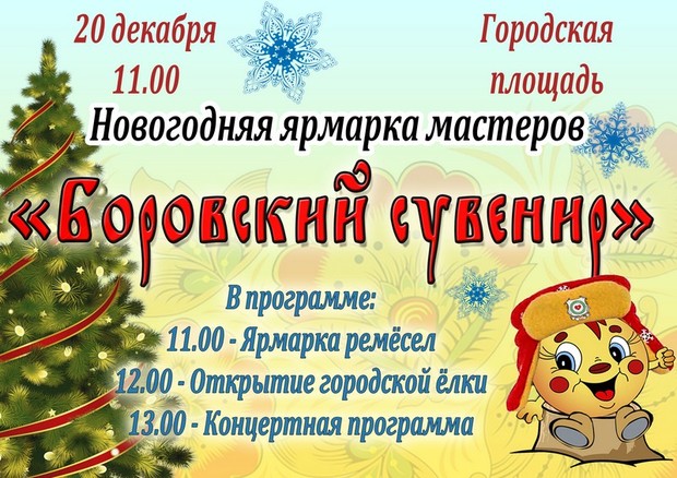 20 декабря к 11 часам дня жителей Калужской области народные умельцы Боровского района приглашают на новогодний праздник - ярмарку мастеров «Боровский сувенир», где покажут свои уникальные работы, проведут мастер-классы, поделятся своим опытом с желающими, а гостям предоставят возможность не только познакомиться и купить понравившиеся выставочные изделия народных мастеров, но и самим принять участие в их изготовлении.