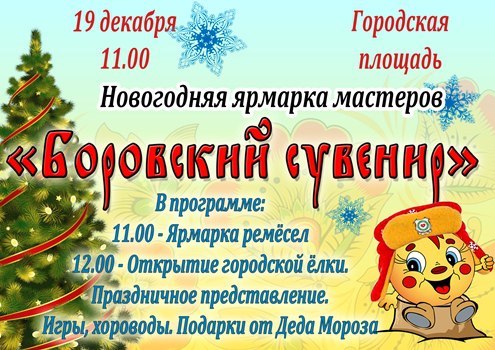 Администрация города Боровска приглашает умельцев, мастеров и ремесленников поучаствовать в зимней ярмарке «Боровский сувенир» с целью популяризации народных традиций, художественных промыслов и ремёсел. По вопросам участия Вы можете обратиться к советнику главы администрации, главе «Гильдии мастеров» Владимиру Кобзарю по тел.: 8(4842) 6-57-89, 8-953-324-78-97.