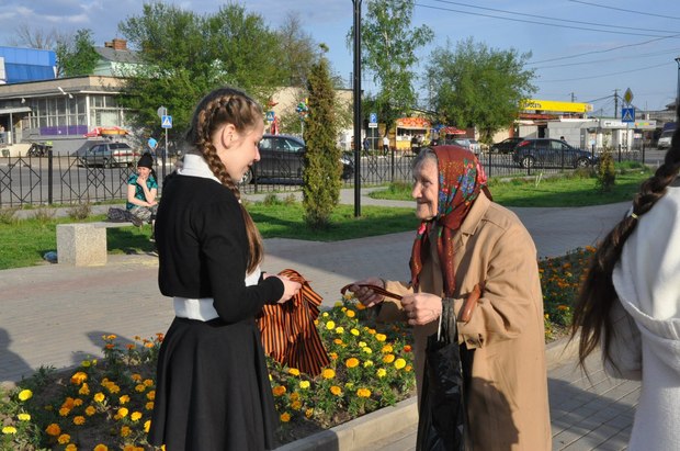 8 мая волонтеры раздавали горожанам георгиевские ленточки
