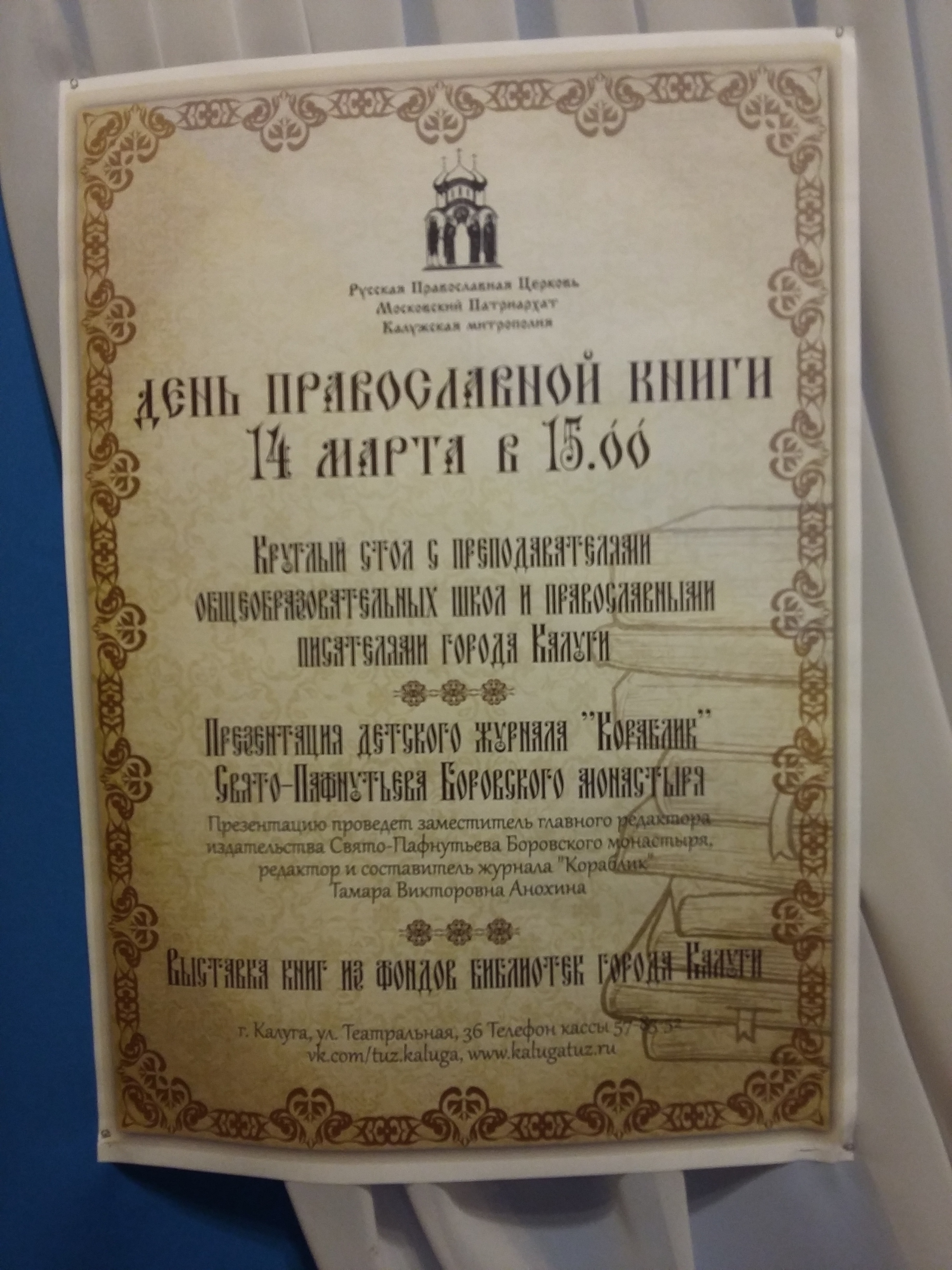 14 марта в фойе Калужского театра юного зрителя по завершению круглого стола, посвящённого Дню Православной книги, организованный Благочинием 5-го округа Калужской епархии и Управлением образования г. Калуги, были организованы выставки православной литературы из фонда ГКУК КО «Калужская областная детская библиотека», где и прошла презентация детского журнала «Кораблик» Свято-Пафнутьева Боровского монастыря, приуроченная к 10-летию журнала.