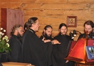 После богослужения в нижнем помещении храма для постоянных прихожан была проведена общая праздничная трапеза. По окончании трапезы отец Иосиф подарил наместнику картину с изображением покровского храма (летний вариант) и архиерейскую панагию, а отец Власий пропел "Ис полла", чем очевидно намекнул на возможно предстоящую в какой-то перспективе архиерейскую хиротонию отца Серафима. Отцу Власию также была подарена такая же картина с изображением покровского храма (осеннний вариант), которая уже через несколько минут благополучно перекочевала в другие руки.