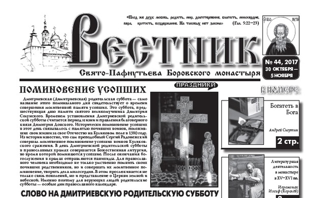 Издательством Пафнутьева монастыря опубликован свежий 44-й номер еженедельника "Вестник", в котором содержится статья о литературной деятельности в монастыре в XV-XVI в.
