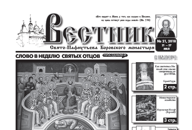 Издательством Пафнутьева монастыря опубликован свежий 20-й номер еженедельника "Вестник", в котором рассказывается о хозяйстве монастыря. Серию материалов об истории основания монастыря и прп. Пафнутии подготовил насельник монастыря, главный редактор издательства иеромонах Иосиф (Королев).
