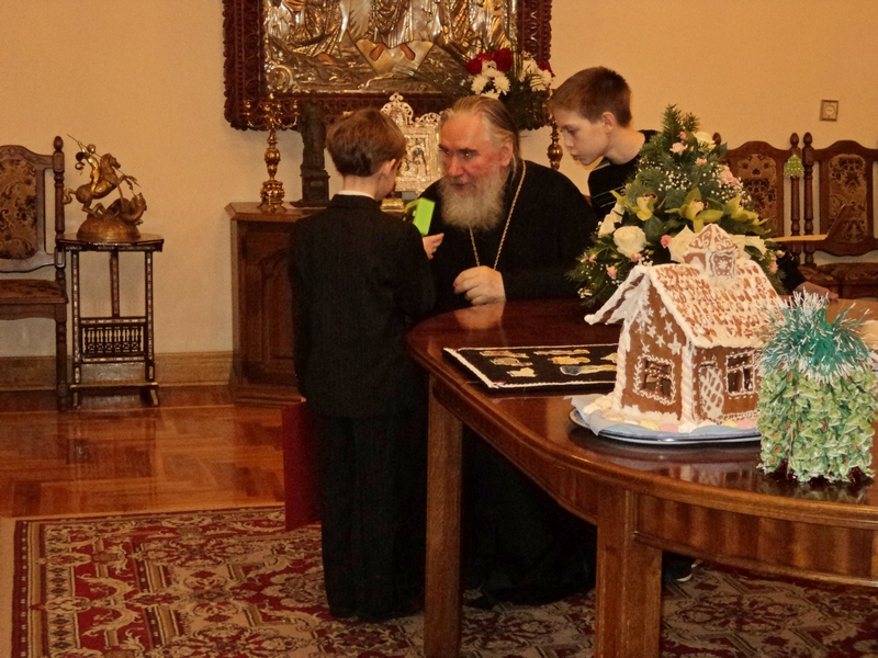 Самым приятным, естественно, был момент получения подарков! Поэтому мальчишки и девчонки сильным потоком хлынули на встречу к батюшке, чтобы получить свой пакетик со сладостями. Затем, все вместе они пожелали отцу Серафиму многие и благие лета и с улыбками "до ушей" стали покидать келью, по дороге непрестанно делясь своими впечатлениями и радостью.