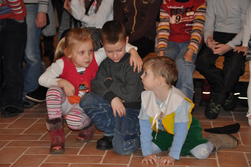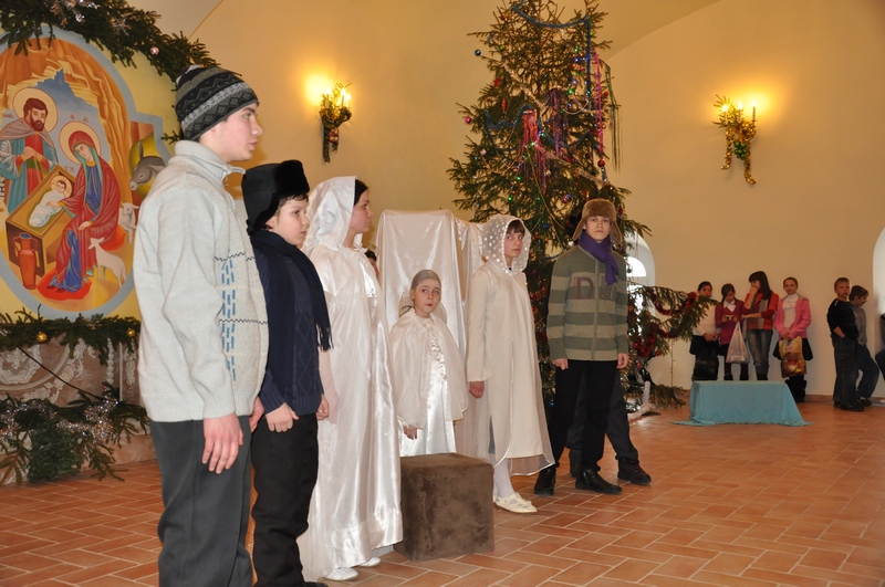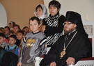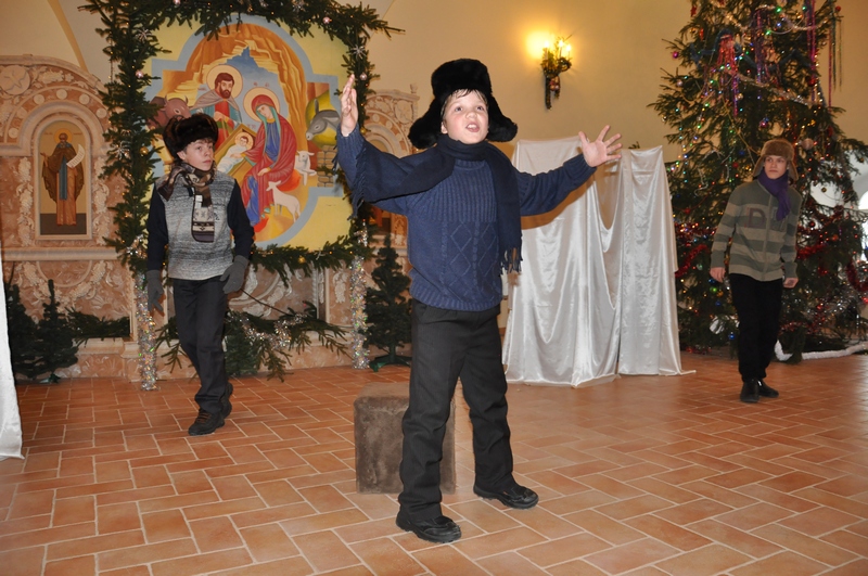 Войдя в трапезную, они ощутили на себе серьезные взгляды детей, которые вмиг сменились на большие искренние улыбки, когда отец Макарий стал играть с ними в различного рода игры, загадывал загадки, просил прочесть стихи, спеть песенки. Все так повеселели, а главное расслабились, что некоторые ребята даже не раз вступали с отцом Макарием в различные интересные дискуссии, много спрашивали, интересовались. Также ребята из дружины спели несколько песен и колядок. После чего, отец Иосиф стал лично поздравлять детей с праздником, дарил им сладкие подарки. Оказалось, что для детей было очень важным получить подарок именно из рук батюшки, поэтому рук, жаждущих сладостей, было несчесть.