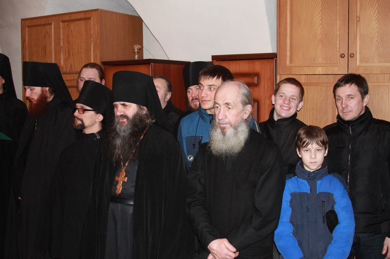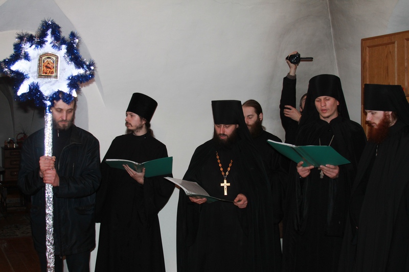 По традиции после поздней Рождественской Литургии вся братия обители ходит колядовать к отцу наместнику. Так было и в этот раз. Все собрались в гостинничном корпусе и хор от лица всей братии долго пел рождественские колядки. После чего у рождественского вертепа было коллективное памятное фото.