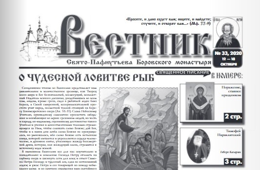 Издательством Пафнутьева монастыря опубликован свежий 33-й номер в 2020 году еженедельника "Вестник". В нем опубликована подборка материалов по вопросам, касающимся жизни Церкви в современном мире.