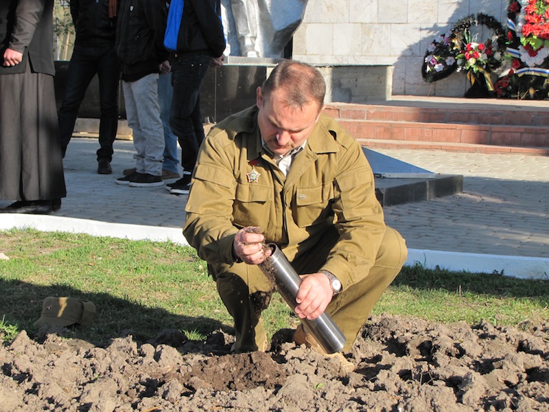 В несколько металлических колб была набрана земля из боровского мемориала, после чего на большом автобусе, нескольких автомобилях и машинах сопровождения с Российскими Государственными флагами делегация выдвинулась в путь.