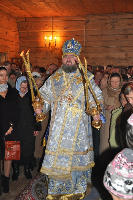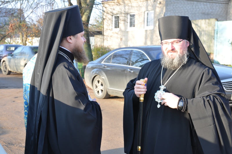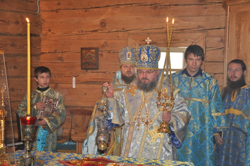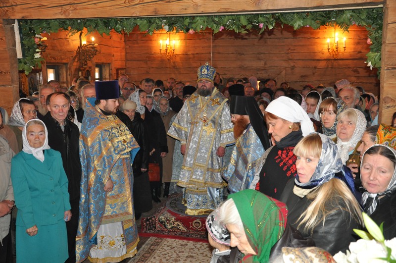 Природа еще дремала во всем своем благолепии. А на Высоком уже шла работа. Все были погружены в приятные хлопоты перед приездом епископа: в алтаре священнослужители приготавливали всё необходимое для Божественной Литургии; на клиросе доставали ноты, открывали нужные книги для пения, а в трапезной повара уже готовили угощения для гостей. Убранство храма было живым, практически все стены и иконы были украшены цветами, что создавало особое тепло и красоту для взора. Вскоре время приблизилось к началу богослужения. Когда же окрестности заполнил радостный перезвон колоколов, показалось, что все деревья и травы, и цветы, и прозрачный осенний воздух, и сердца всех собравшихся в храме в этот день людей покрыло волной теплой радости. Гостя из Епархии, епископа Людиновского Никиту, встретили цветами и хлебом-солью. Владыка возглавил Литургию в сослужении наместника монастыря архимандрита Серафима (Савостьянова), настоятеля подворья иеромонаха Иосифа (Королева), иерея Антония Хатынцева. На клиросе пел монастырский хор. Торжественная неспешная служба и небесный цвет богослужебных одеяний, который является цветом вечности, смирения и благочестия, цветом Богородицы, гирлянды из лилий и роз, украсивших иконы в храме, - все это создавало ощущение особенной радости и душевного трепета. Незаметно бежало время, отчего совсем неожиданно подошла к концу литургия. И вот началось самое главное - причастие. Большое количество детей и взрослых со сложенными руками стали приступать к чаше со Святыми Дарами. Затем был совершен крестный ход вокруг храма. К народу с крестом вышел епископ Никита с проповедью. В своей проповеди Владыка напомнил о том событии, в честь которого установлен этот праздник, о том, как над молящимися во Влахернской церкви окрылись небеса и в воздухе появилась, блистая Божественным светом, Царица Небесная в окружении множества Ангелов и Святых. Она простирала омофор над людьми и молилась о них: на следующий день греки одержали победу над врагами. Россию называют уделом Пресвятой Богородицы, поэтому праздник Покрова здесь отмечается как великий, приравненный к двунадесятым праздникам, день. Владыка напомнил и о том, что еще на Голгофе, когда Апостолы покинули распятого Иисуса и он в страшных муках умирал на Кресте, Пречистая, преисполненная материнской любви, стояла рядом с Ним. Взглянув на Нее, Иисус указал на рядом стоящего ученика Иоанна, сказав: «…Се сын твой», а ему: «…се Матерь твоя!». Святые отцы, объясняя этот поступок Господа, говорят, что в страшную минуту страданий Христос через Иоанна Богослова, усыновил Своей Пречистой Матери весь христианский род. И с тех пор Пресвятая Богородица проявляет Свою Богоподобную любовь ко всем, прибегающим к Ней с верою и любовью, а мы все прибегаем к Ее помощи, как к заступничеству самого родного и близкого человека. Владыка поздравил всех с праздником, все получили иконки Покрова Богородицы с благословением. Праздник продолжился торжественной трапезой.В завершение хочется сказать о неслучайности того, что храм подворья монастыря именуем в честь Покрова Пресвятой Богородицы. Очень важно, чтобы у посаженного ростка была благоприятная почва для правильного роста. Так и люди, пришедшие и прикоснувшиеся к вере, порой нуждаются в укреплении и закреплении полученного опыта. Таким обра