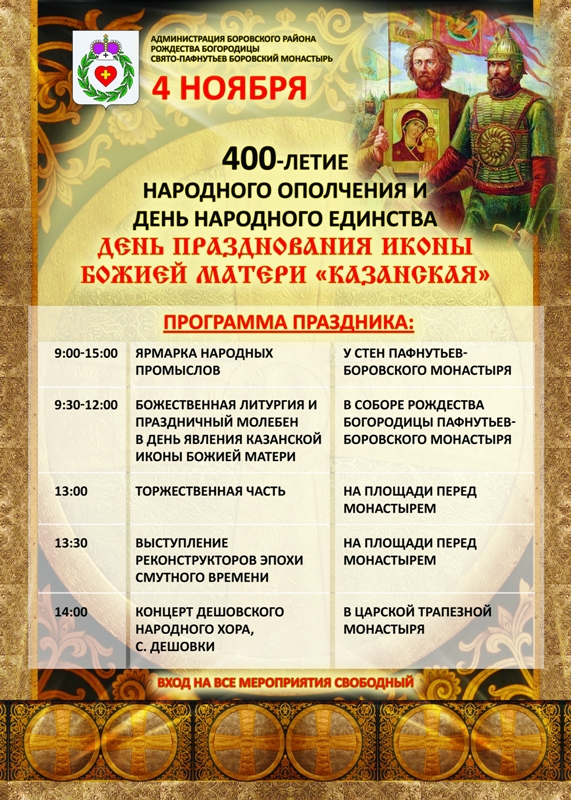 Программа празднования 4 ноября Казанской иконы Божией Матери и Дня Народного единства.