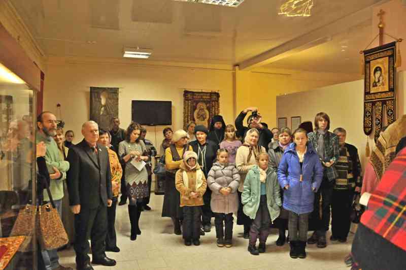 На открытии выставки присутствовали: Александр Владимирович Билецкий, руководитель центра традиционного искусства и ремесла России «Сень», Марина Владимировна Бирюкова, преподаватель лицевого шитья иконописной школы при Московской духовной академии, Татьяна Викторовна Хребина, кандидат искусствоведения, специалист по современному церковному шитью Академии художеств Санкт-Петербурга, заведующая отделом культуры администрации Боровского района Ирина Алексеевна Башкирева, научный сотрудники и работник музея Нелли Петровна Лошкарева, директор музея Александр Михайлович Морозов. По благословению архимандрита Серафима (Савостьянова), наместника Свято-Пафнутьева Боровского монастыря с приветственным словом выступил иеромонах Савва (Петрушко).
