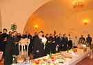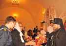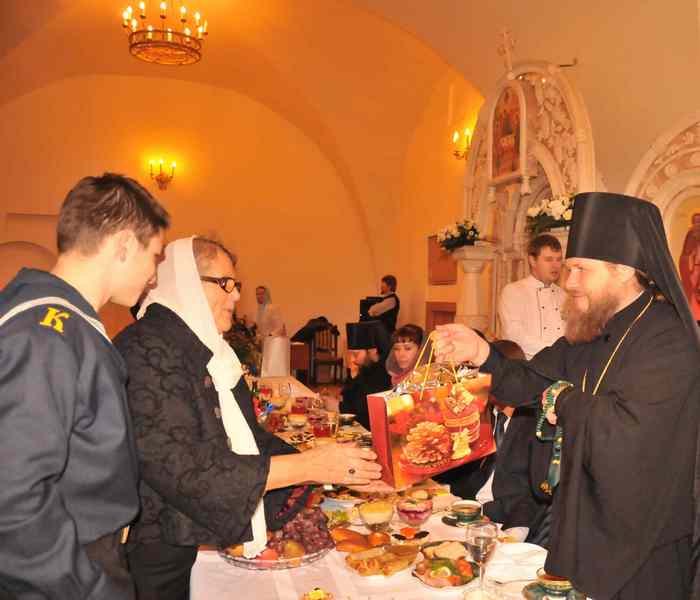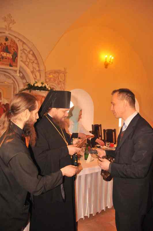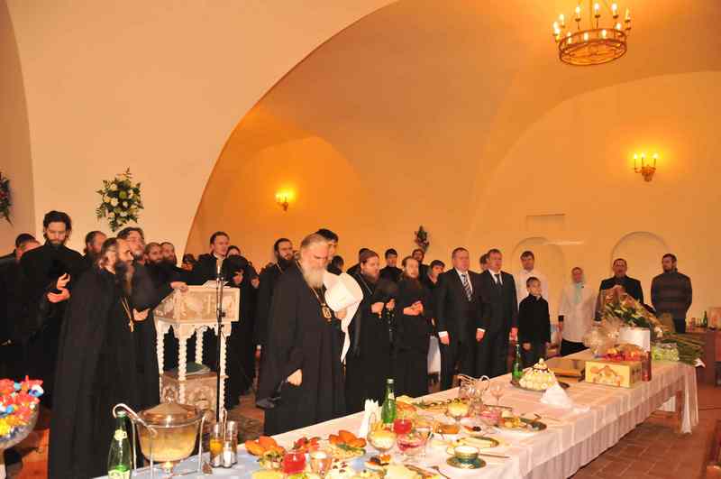 Затем все были приглашены в трапезную монастыря на праздничный обед, во время которого братский хор исполнил множество старинных русских и духовных песнопений. Во время трапезы Владыка Климент обратился к присутствующим с архипастырским словом, в котором он особо отметил заслуги архимандрита Серафима (совместно с братией монастыря) в установлении добрых отношений с руководством г. Боровска и Боровского района, что способствует духовно-нравственному просвещению детей и молодежи района.