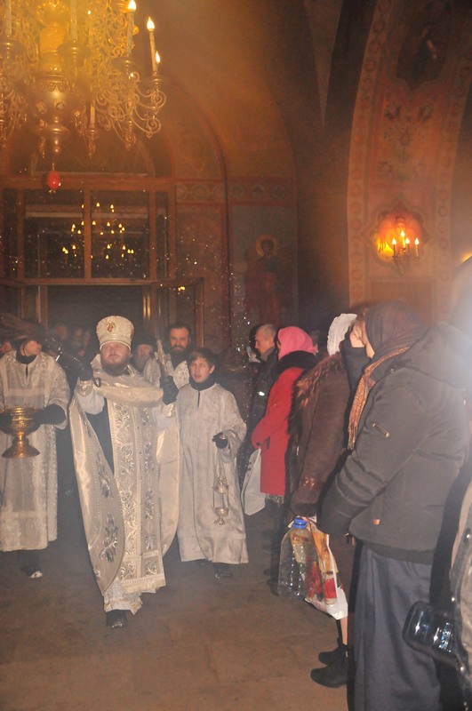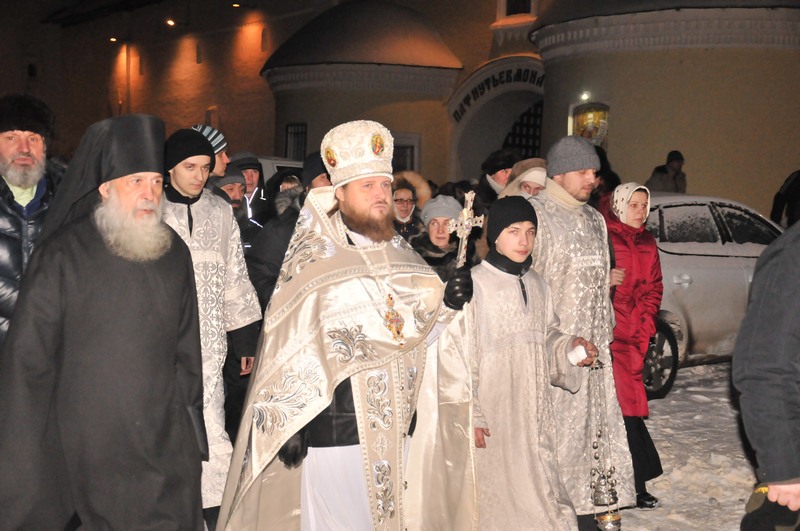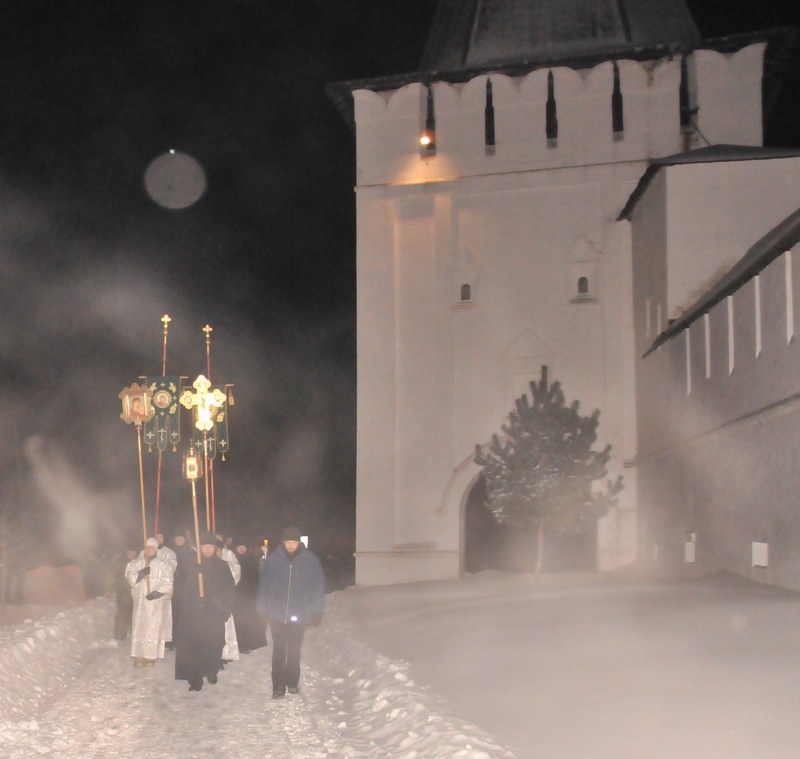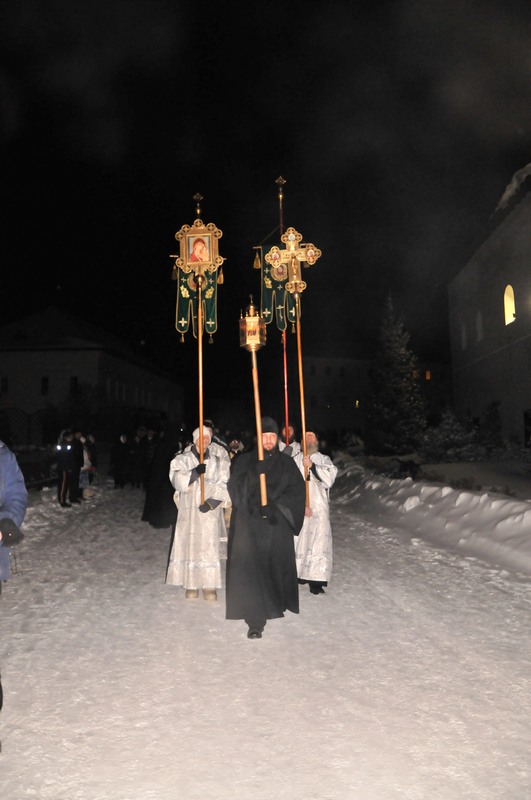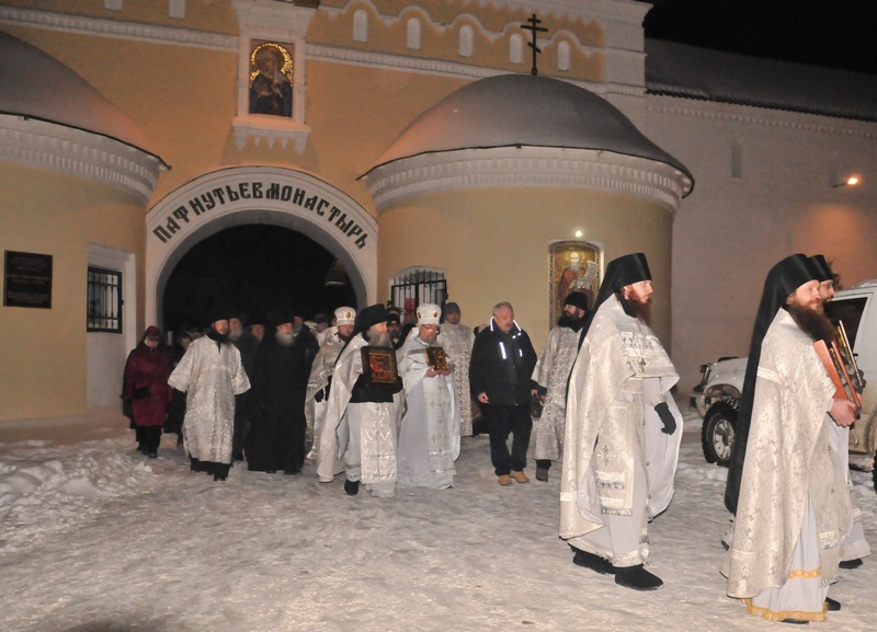 После Литургии был крестный ход на источник преподобного Пафнутия, где было совершено Великое освящение воды. Освящение воды началось уже 18 января, после чего вода освящалась в монастыре весь праздничный день до вечера субботы.