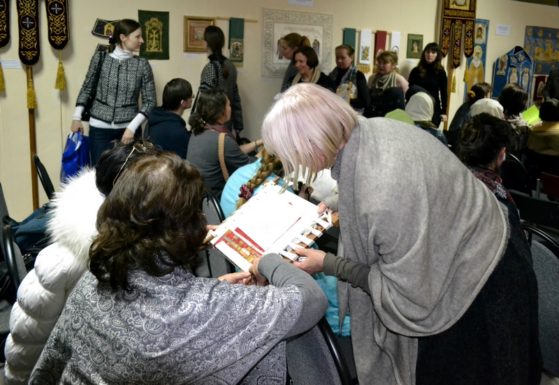 Со вторым - «Техника шитья пёрышек ангелов на примере Плащаницы (1598г.) вклада кн. И.И.Голицына в Свято-Троице-Сергиеву Лавру» знакомила Кафедра золотного и лицевого шитья Православного гуманитарного института «Содействие».