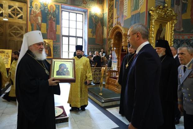 Глава митрополии поздравил В.В. Шапшу с переизбранием на пост главы региона, пожелал ему помощи Божией в трудах, крепости сил и подарил Казанскую икону Божией Матери.