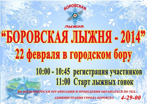 22 февраля 2014 года администрация города Боровска приглашает всех желающих принять участие в открытых спортивных соревнованиях по лыжным гонкам «Боровская лыжня – 2014», чтобы с пользой провести время и внести свой вклад в популяризацию лыжных гонок в городе и районе.
