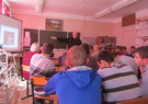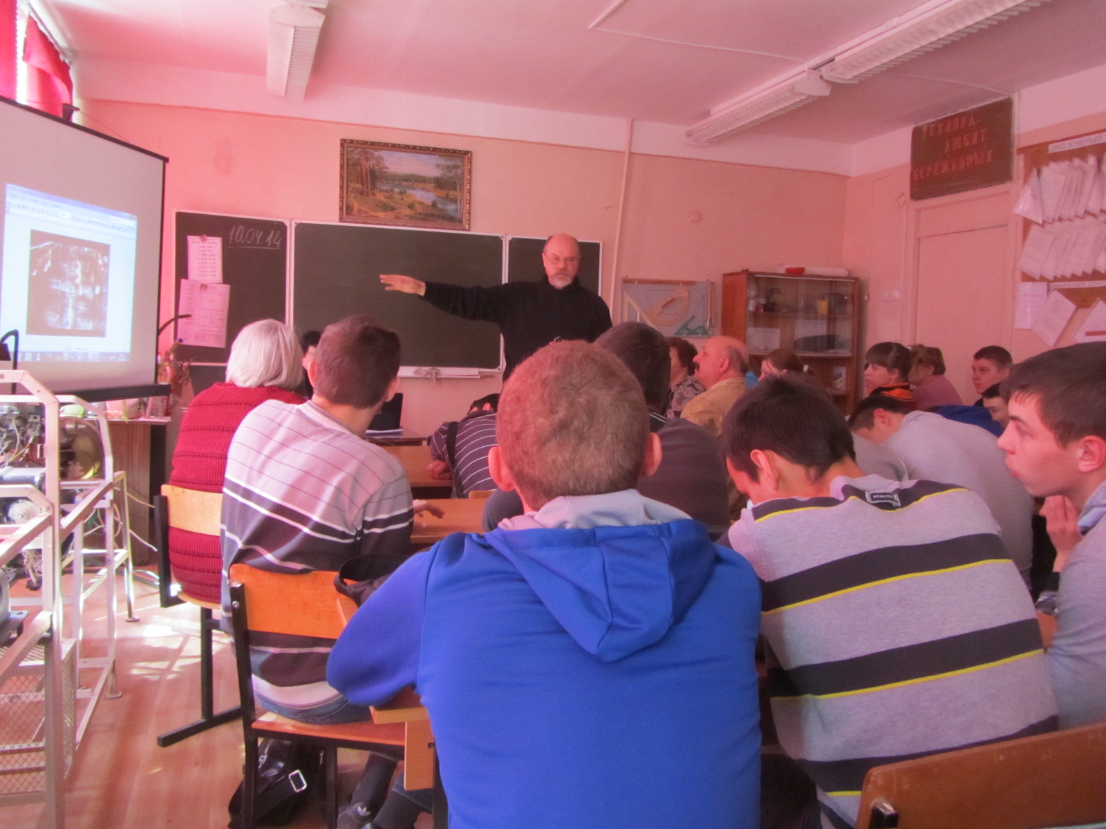 Отец Максим Смирнов частый гость в военных частях и школах. И в Ермолинском техникуме, куда он приехал, чтобы рассказать студентам о Плащанице и Воскресении Христовом, он был уже в четвертый раз. И его здесь хорошо знали. Чтобы посмотреть фильм и послушать отца Максима в кабинете социальной педагогики собралось две группы студентов. Поэтому пришлось установить несколько рядов дополнительных скамеек. Первой слово взяла заместитель директора по учебно-воспитательном работе Антонина Семеновна Ященко. Она сказала простые и искренние слова, от которых многим расхотелось смотреть в телефоны, а захотелось послушать своего учителя. «Один иностранец как-то сказал, что все страны граничат друг с другом и только Россия – с Богом».