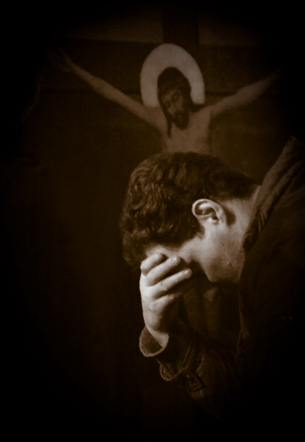 Он стоит на коленях и плачет: